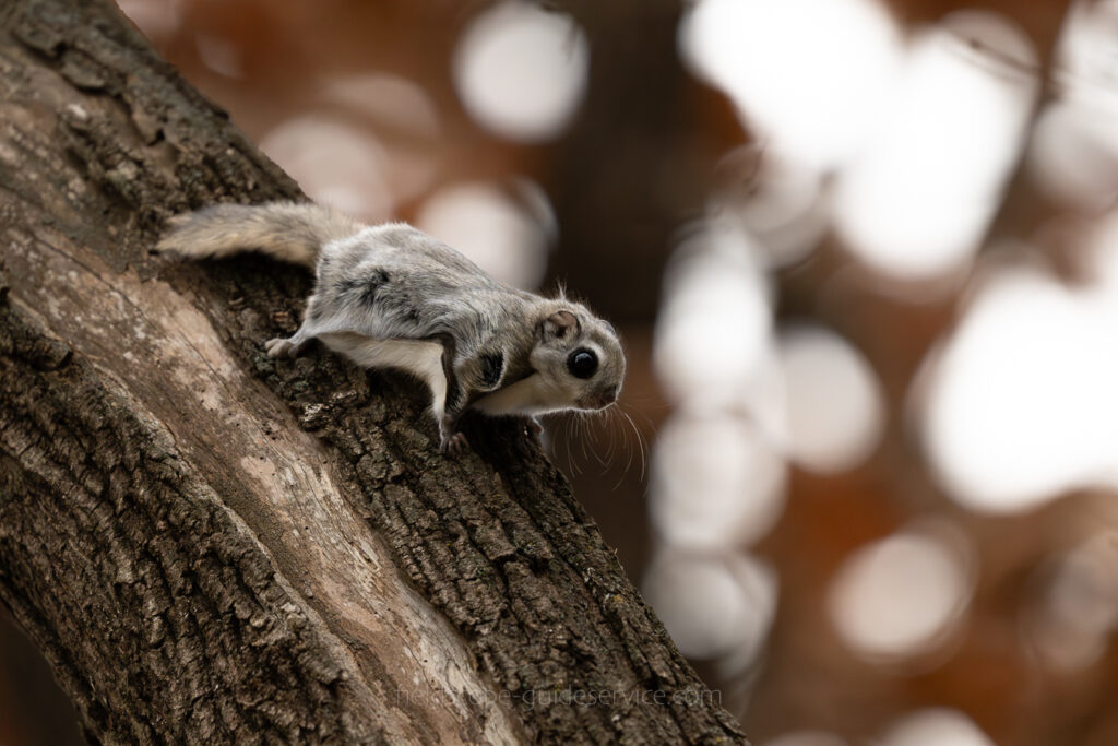巣穴には8~9匹のモモンガが住んでいて、そのうちの半分近くが体が小さく若いモモンガ。若いモモンガは警戒心が強くて、少しの物音でとても素早く動き回るので落ち着いてと願いながら枝の前で座って静かに待っていると・・・日が沈み、牡鹿のラッティングコールが響く中で巣穴から数匹の若いモモンガが出てきて幹を走ったり、登ったり。