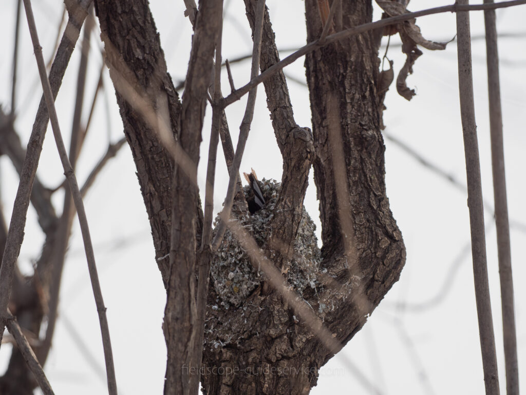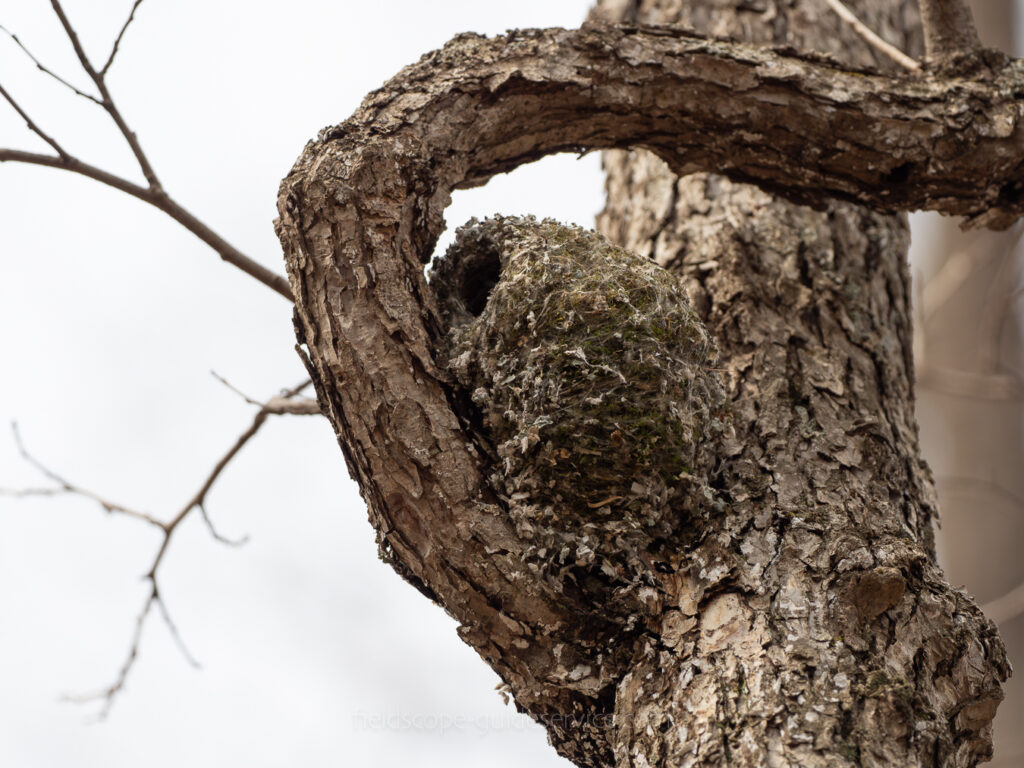 “Is it that time already?” I wondered. Looking through my binoculars, I saw one of them carrying something in its beak. It wasn’t the aphids they usually eat; it was white, round, and about the size of a pill bug. With the object still in its beak, the bird vanished into the depths of the forest.