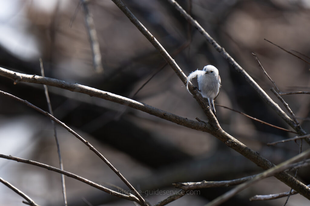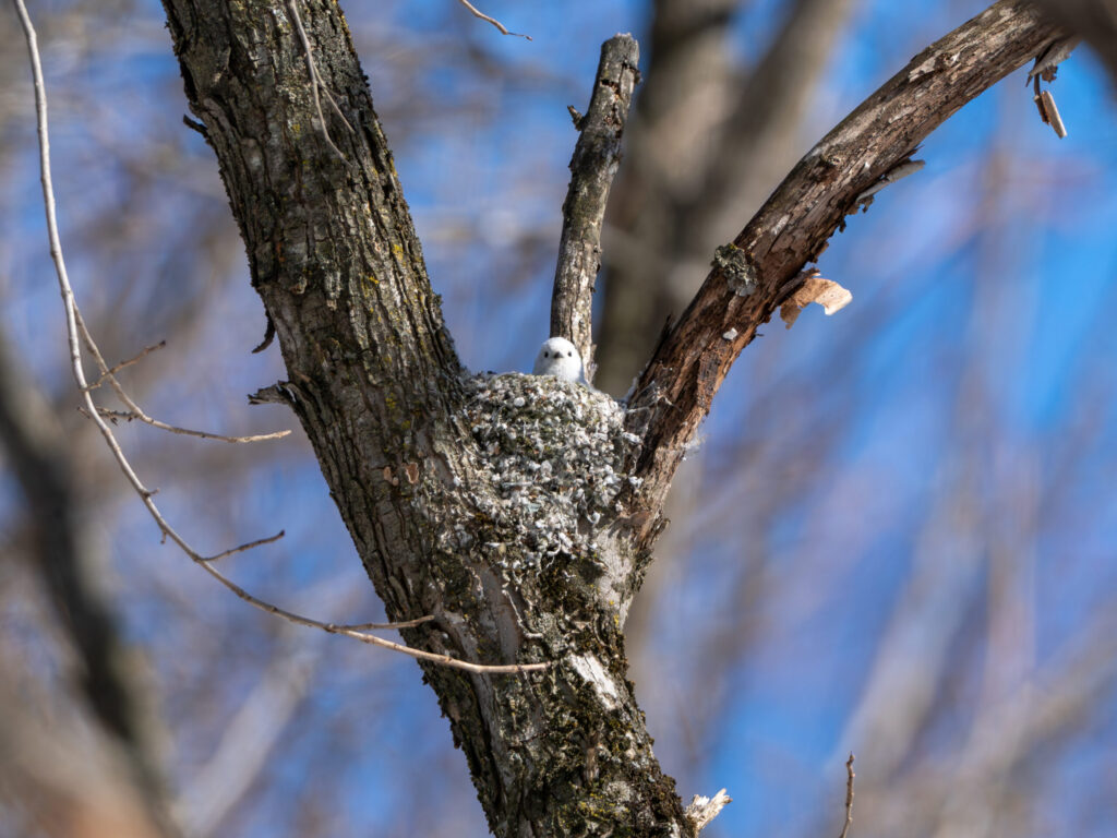 もうそんな季節かと思い、双眼鏡で見てみると口に何かを咥えています。よく食べているアブラムシでは無いし、白くて丸くてダンゴムシくらいのサイズでした。シマエナガはそれを咥えたまま、林の奥に飛んでいってしまいました。