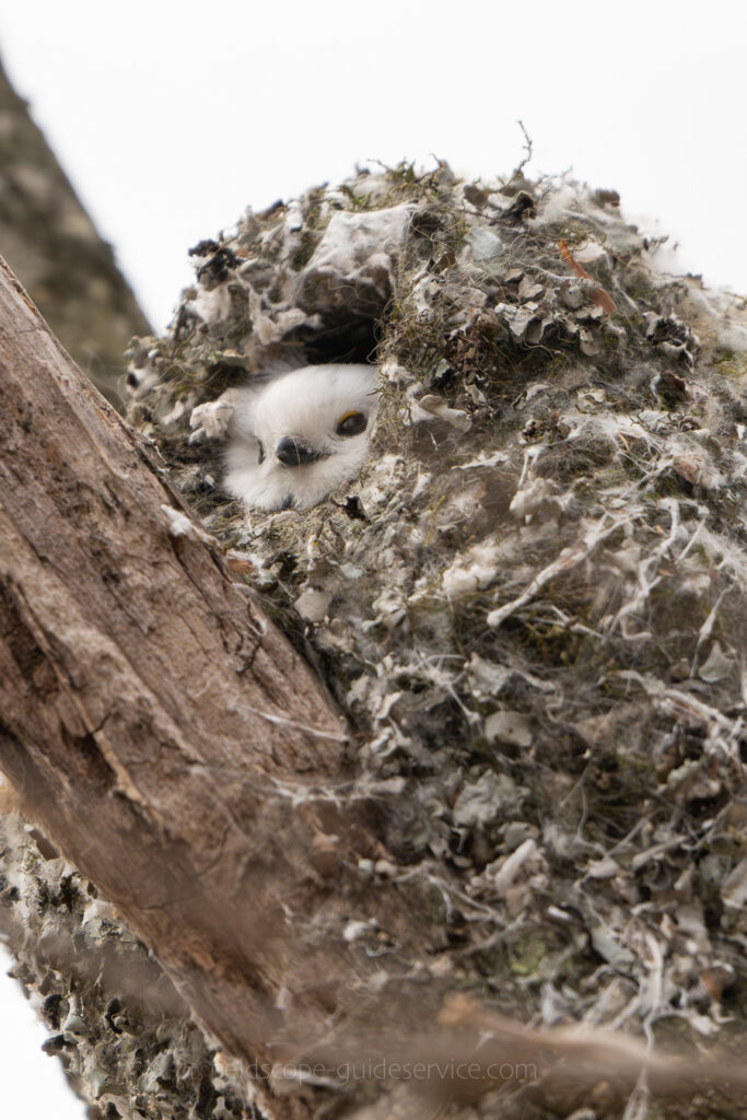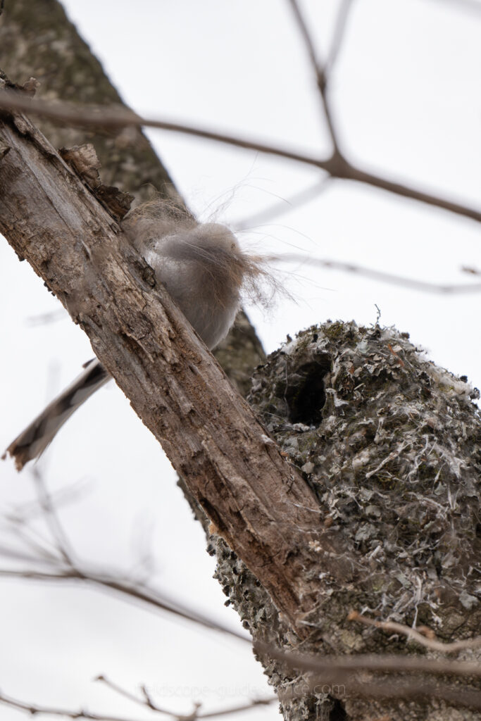 シマエナガの巣はとても柔らかくて、彼らが中に入り作業をしていると巣の全体がモコモコと動き、よく伸び縮みするのが見られます。屋根までできるとピンポン玉くらいの大きさの入り口もついて、卵形の見事な造形美が完成します。
